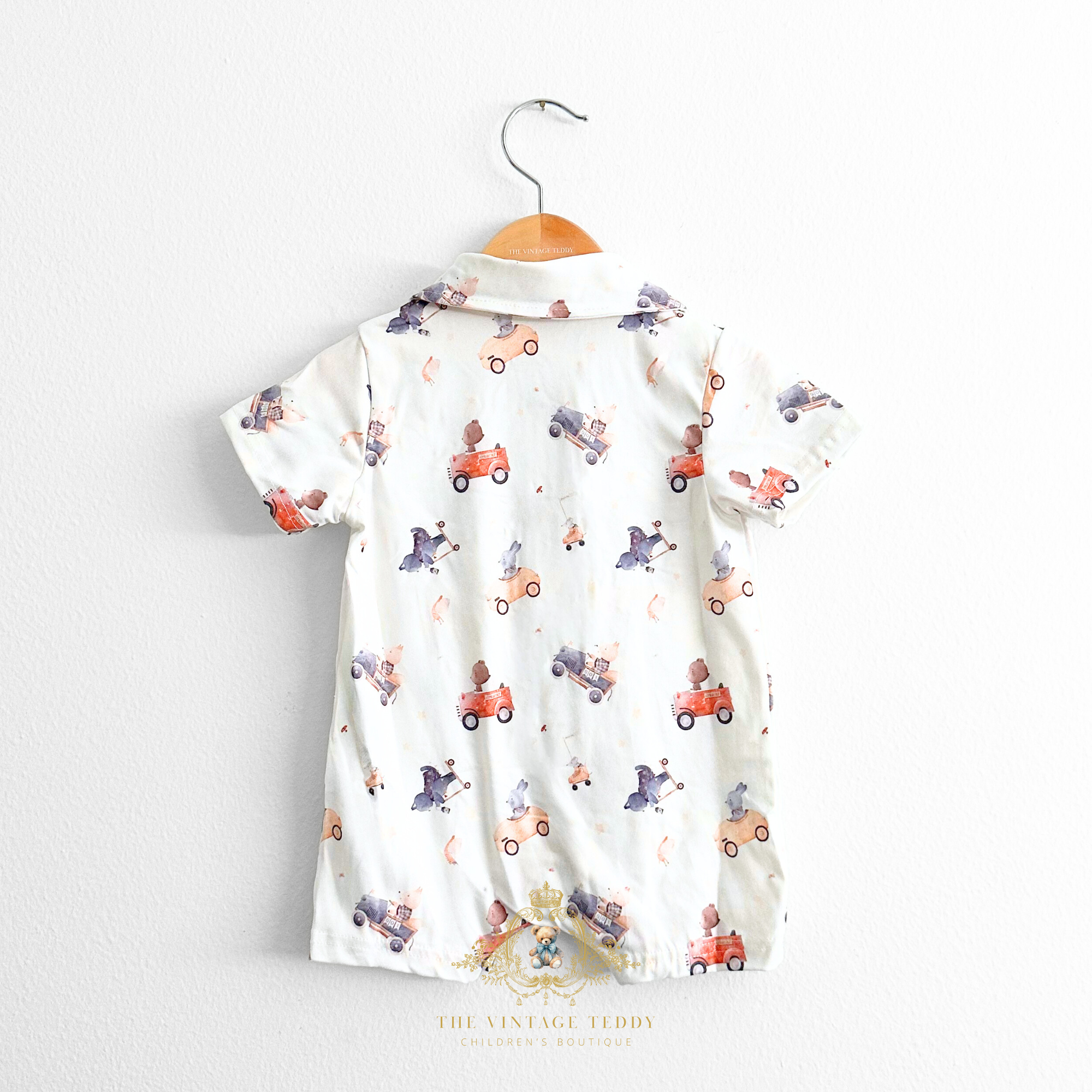Boys Oxford Short Sleeve One-Piece Romper Shorts Bear & Friends in Cars