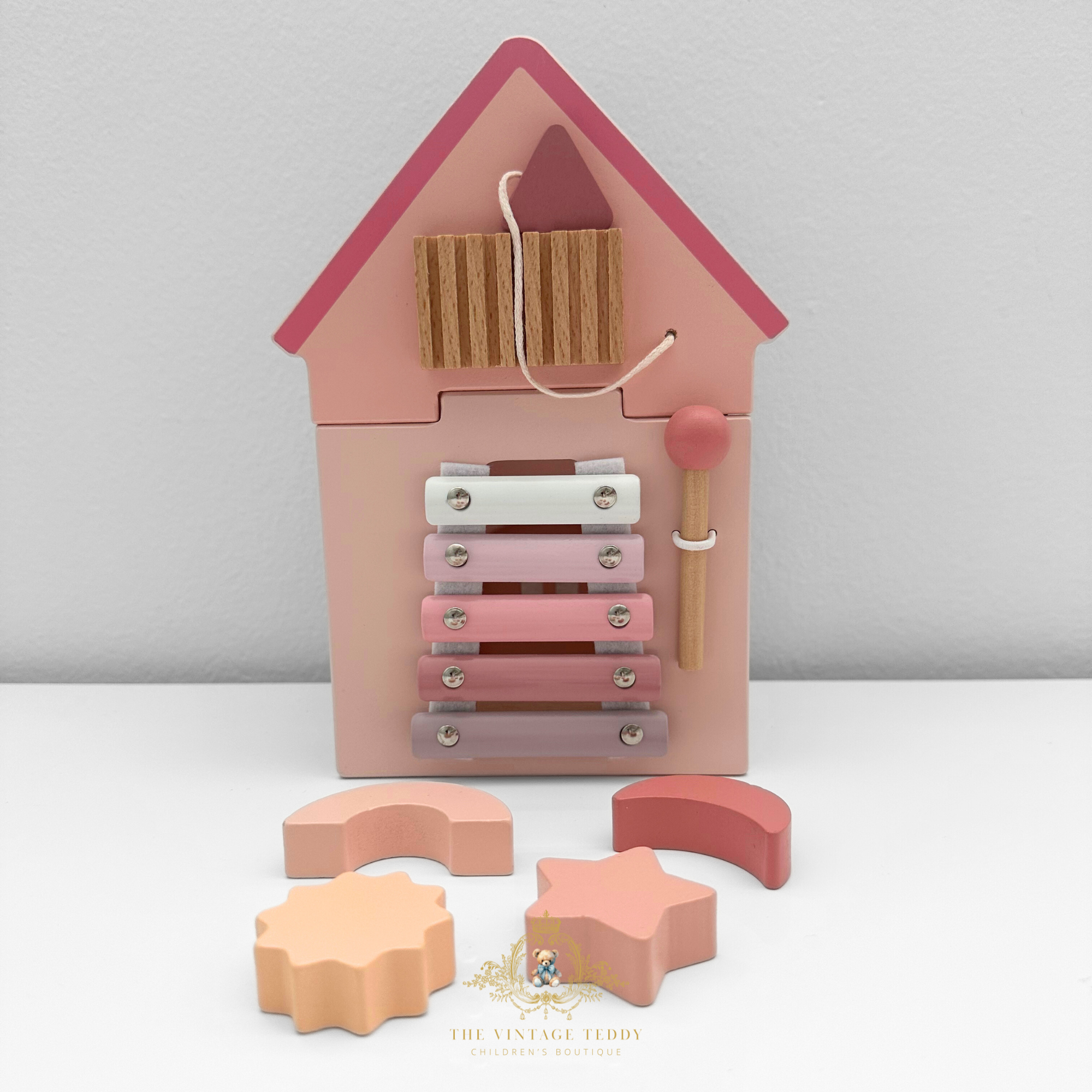 Details: Little House Activity Center is Made out of Wood, Sections Feature House, Abacus Wood Beads, Music Instrument Xylophone, Rainbow, Sun, Moon & Star Matching Shapes Puzzle