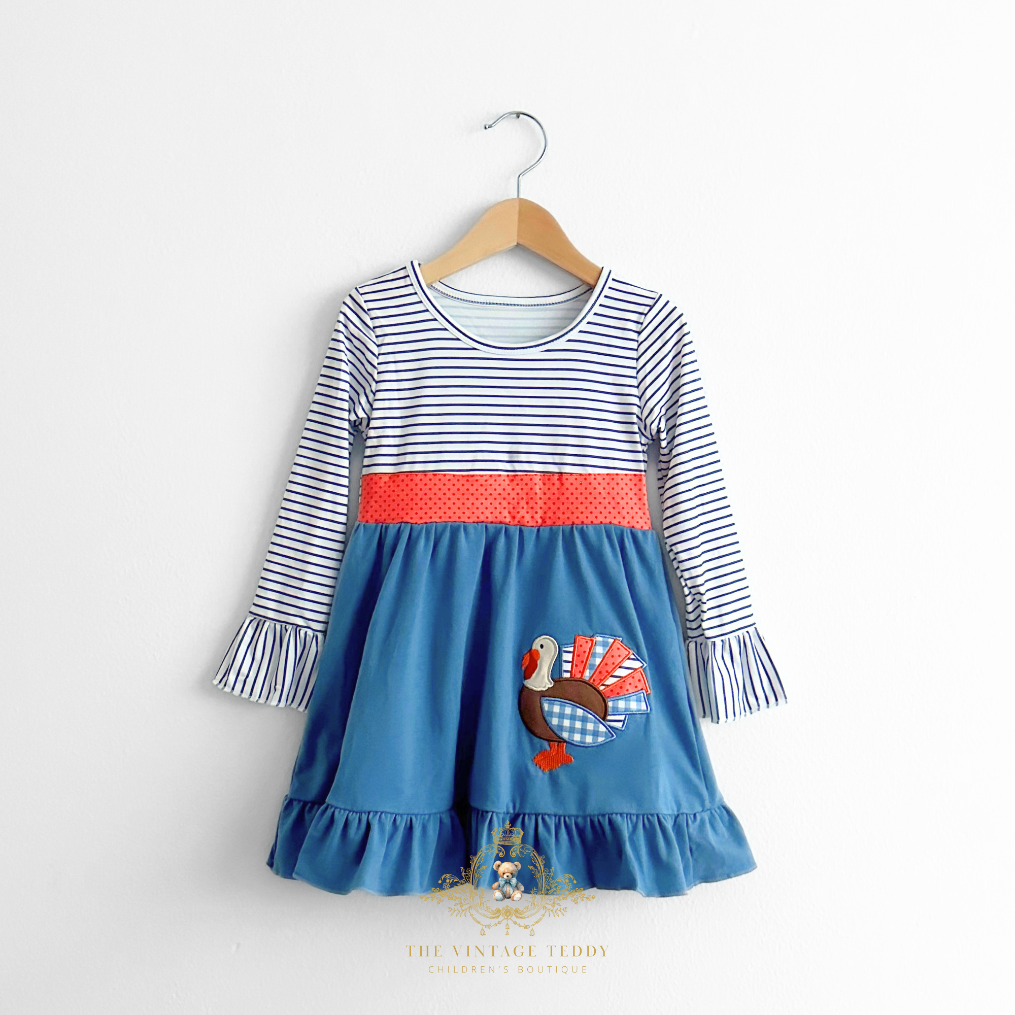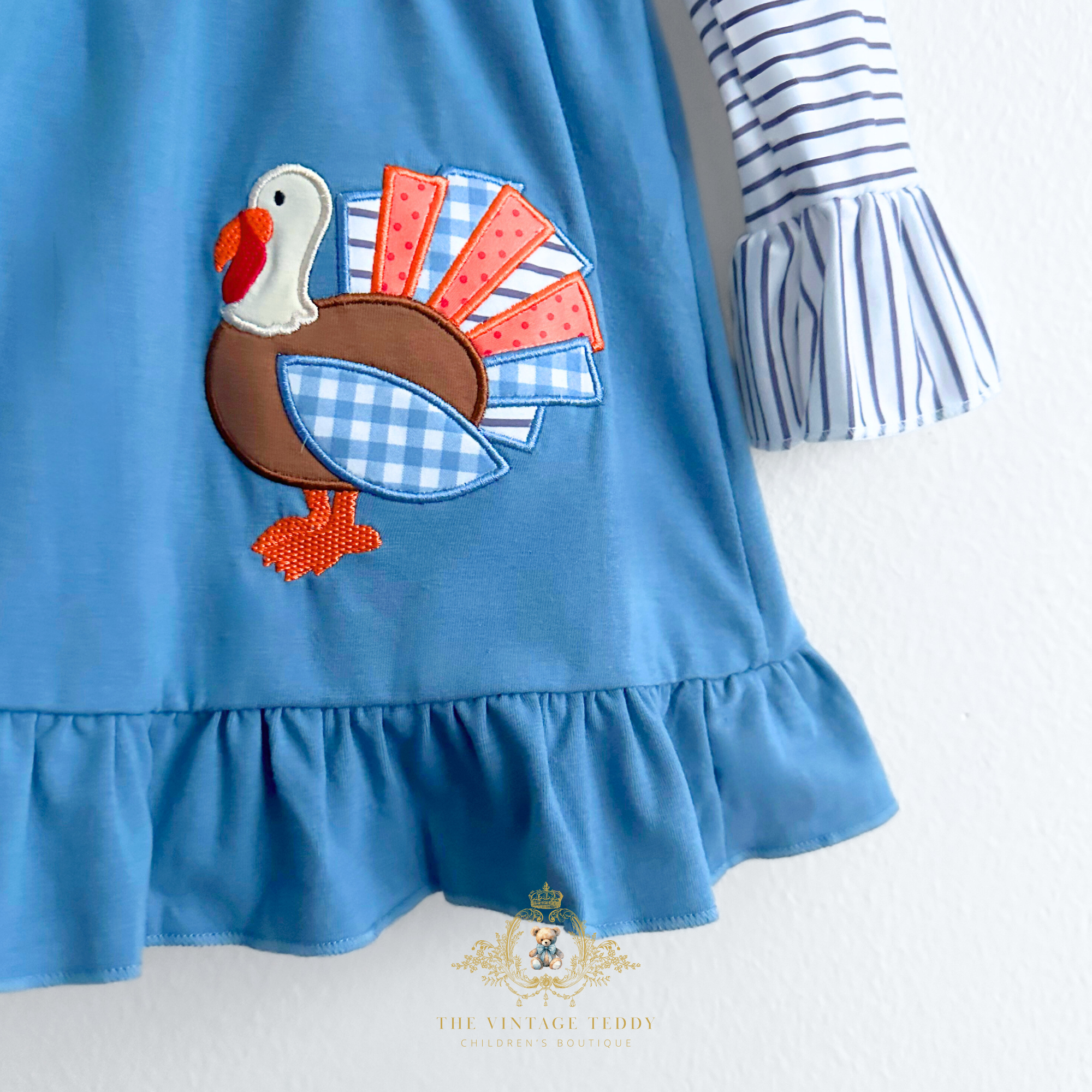 • Details: Embroidered Patchwork Turkey Appliqué Thanksgiving Theme, Gingham & Stripes, Round Collar, Long Sleeves, Ruffled Cuff & Hem, Fit & Flare, Knee Length, Light-weight & comfy for all day wear