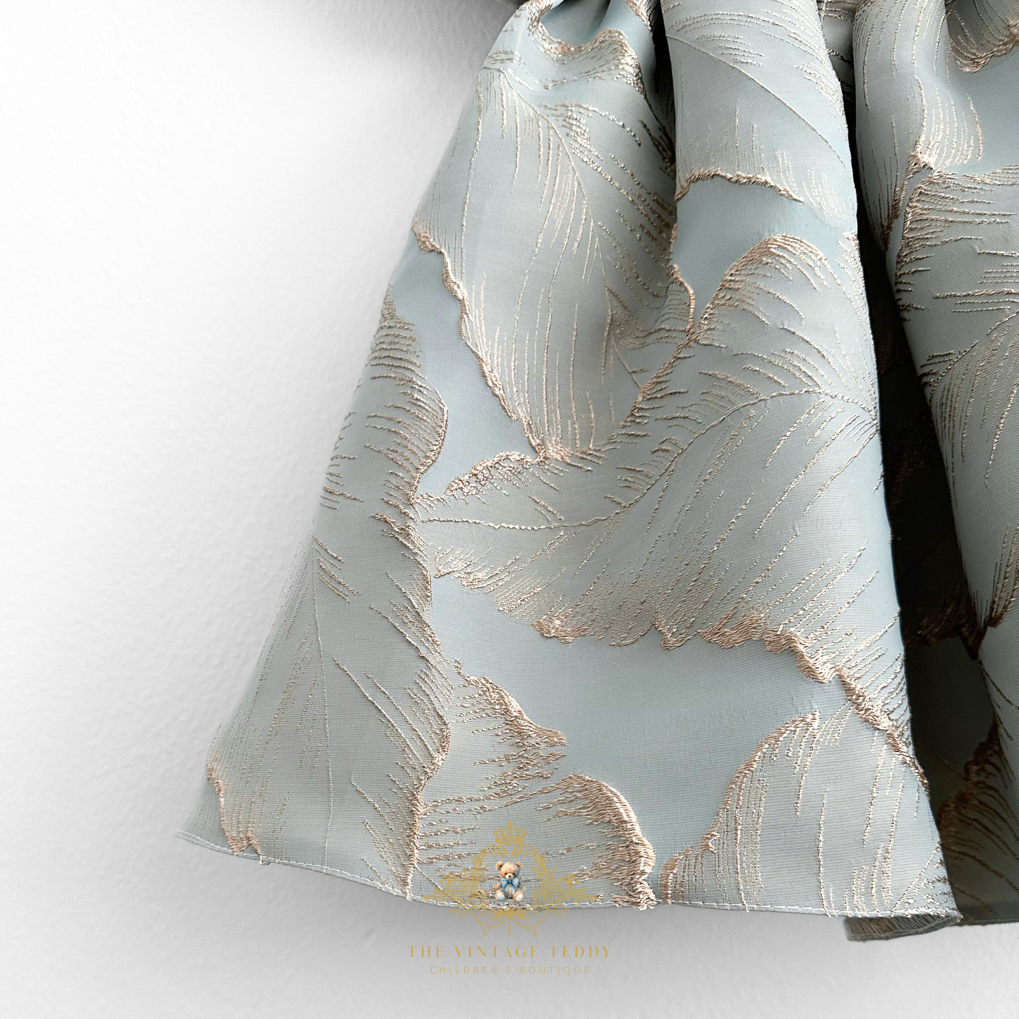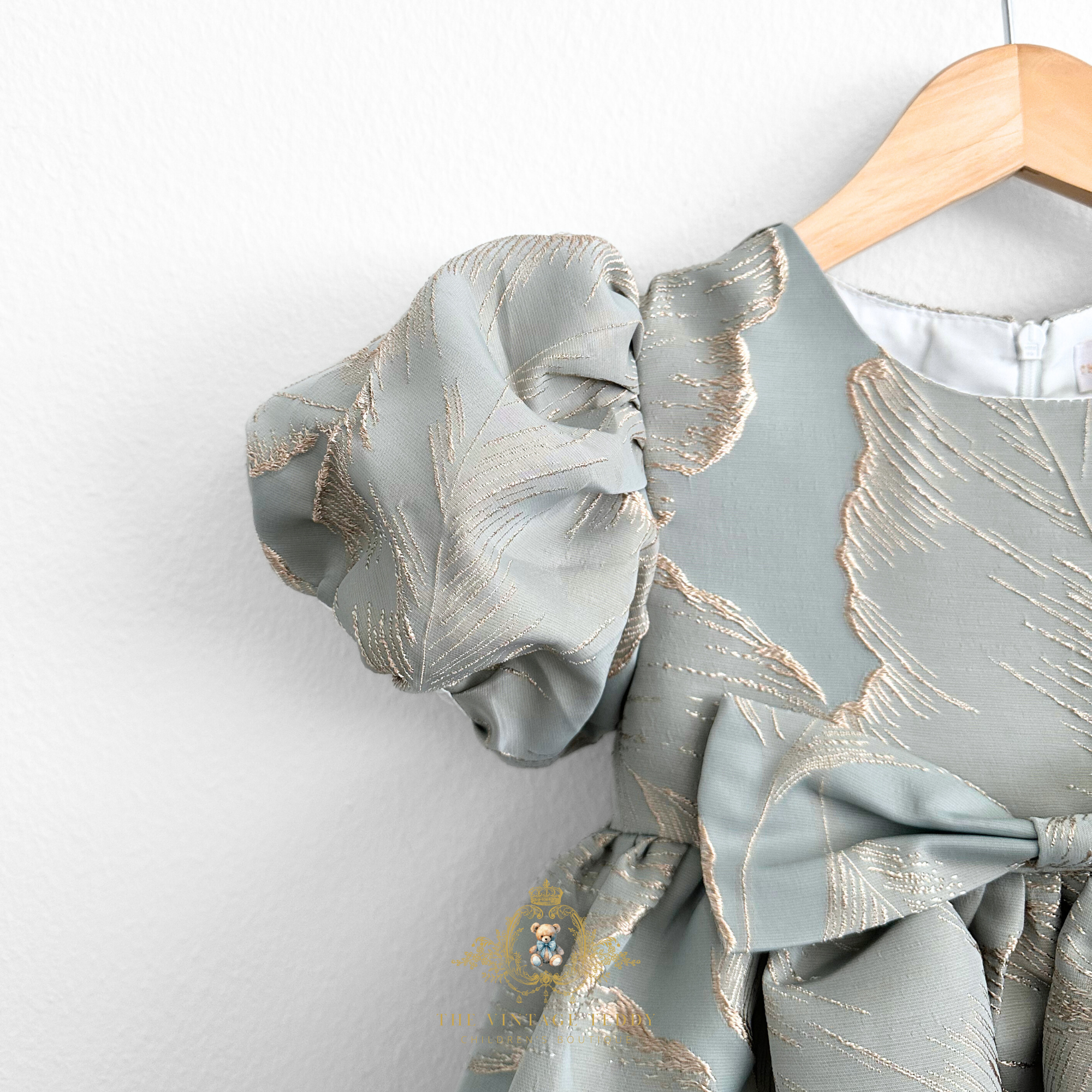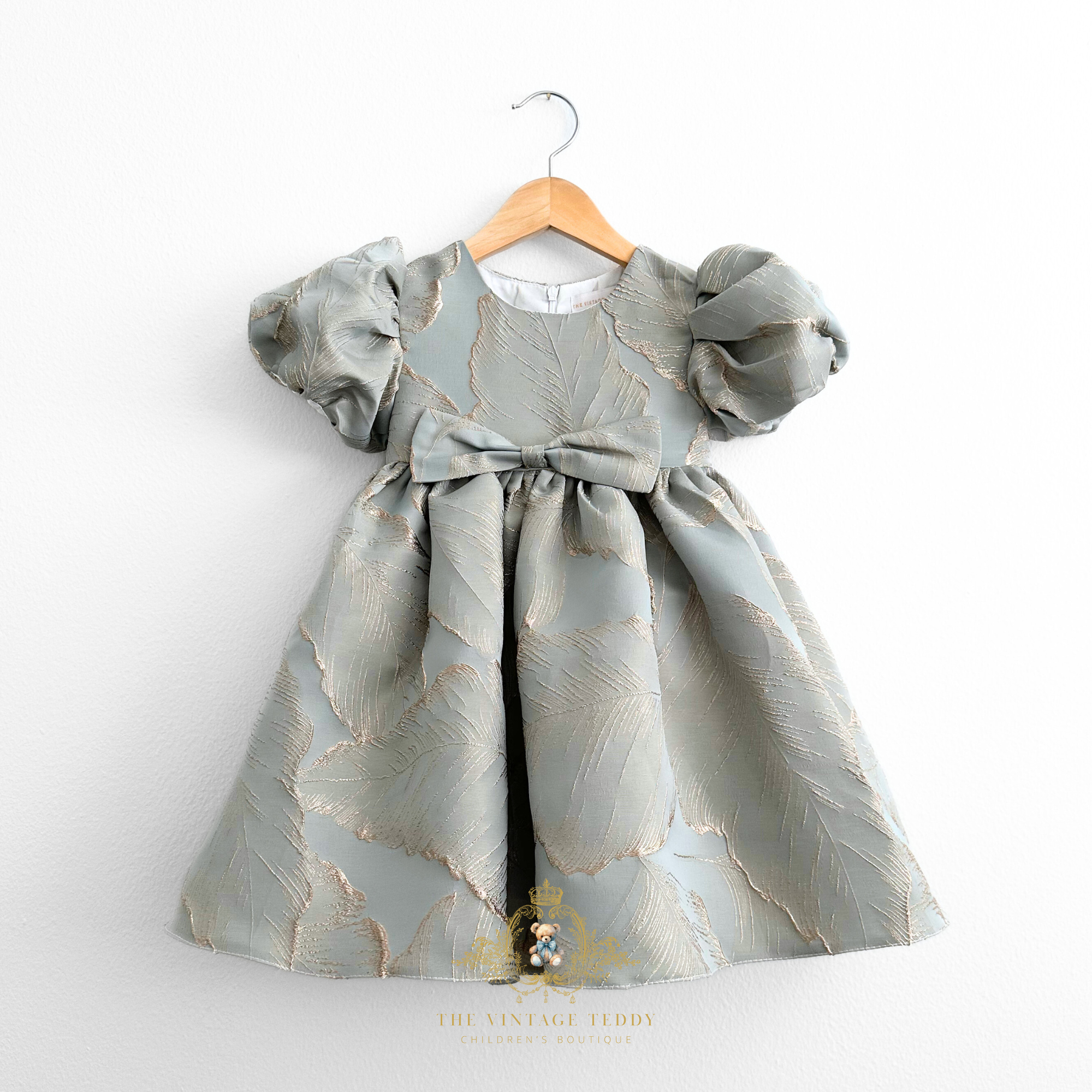 Girls Fine Jacquard Celebration Dress Floral Sage Green & Gold Leaf