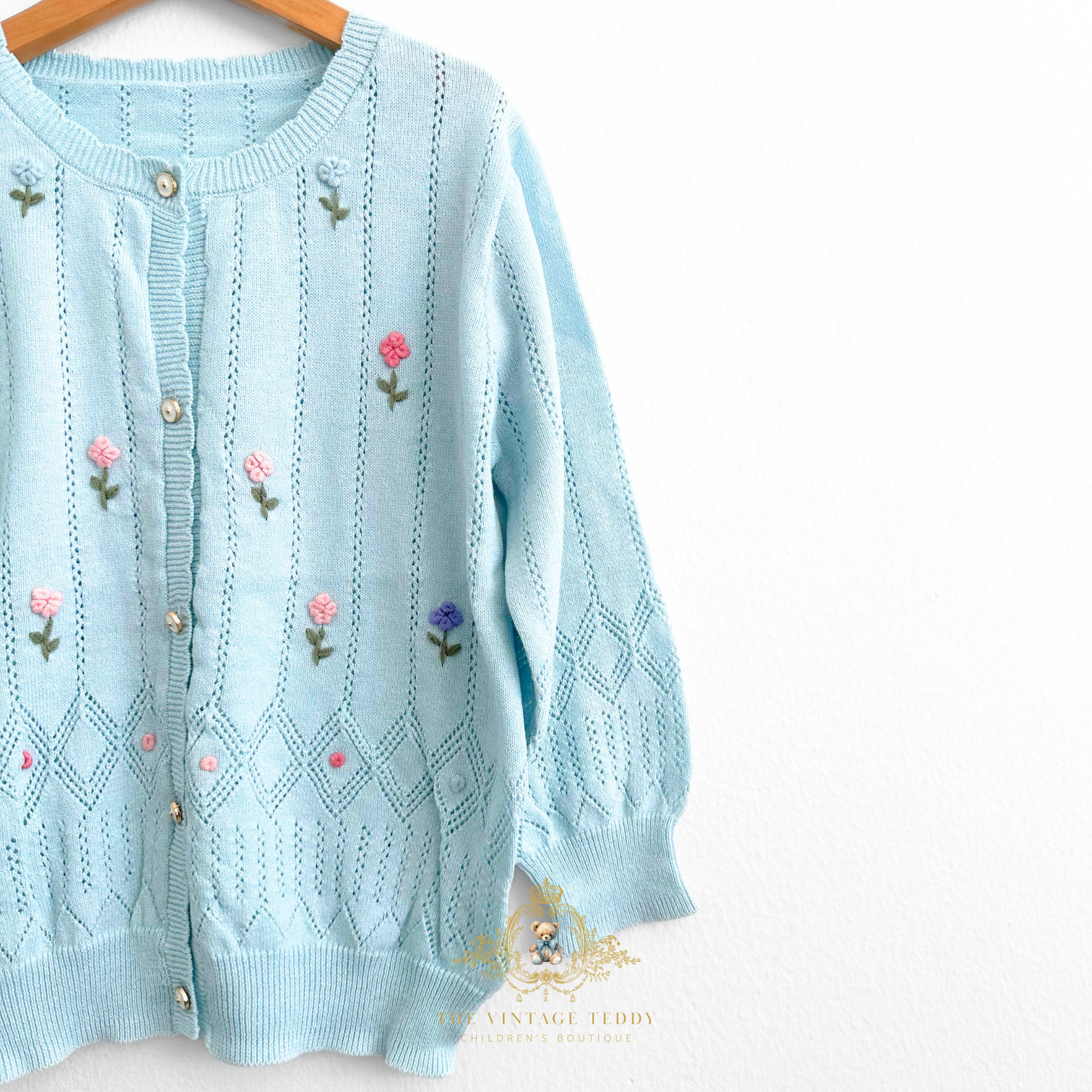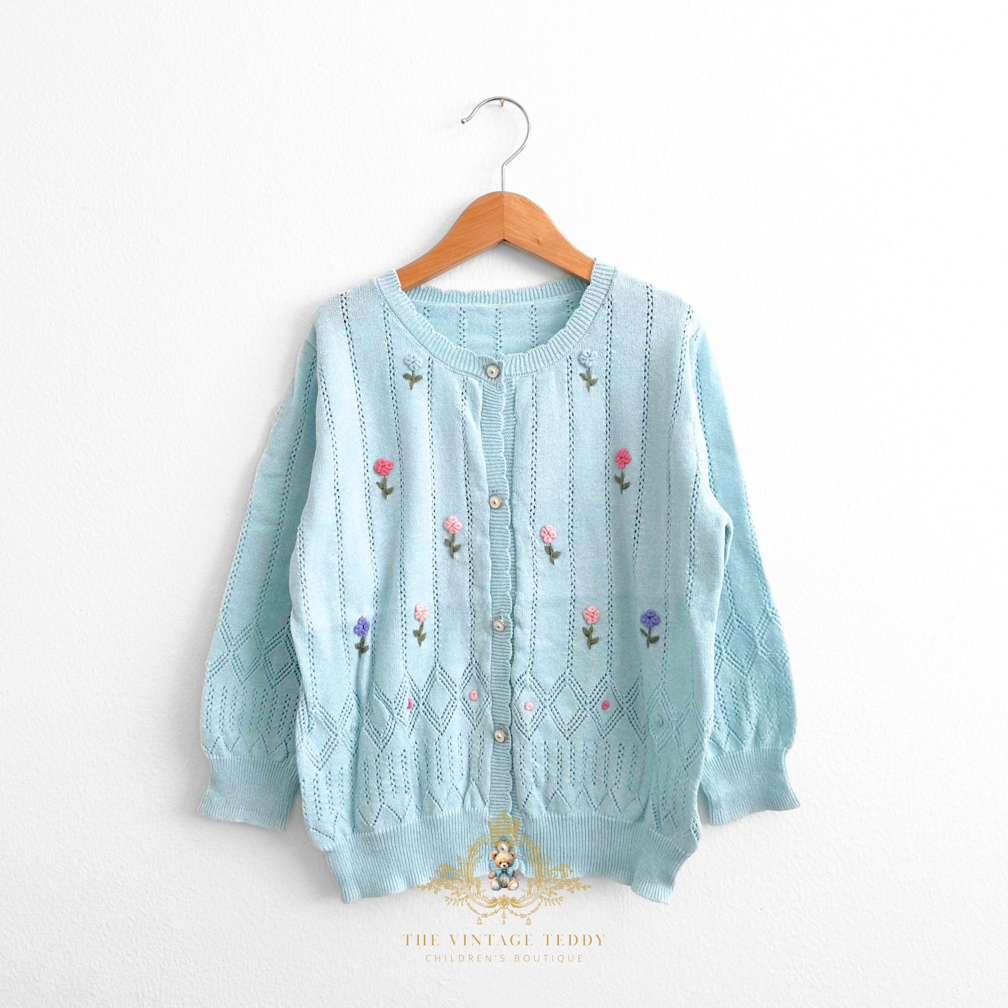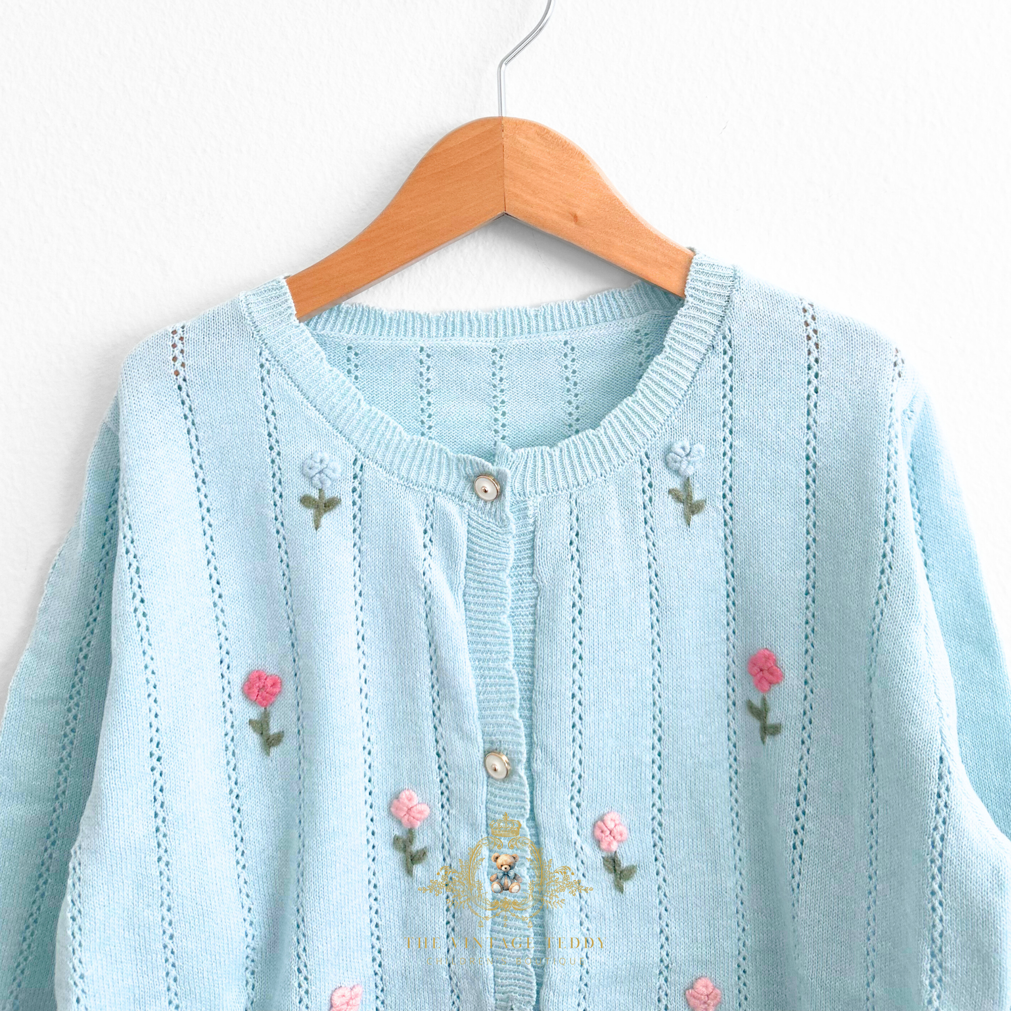 This charming cardigan brings a touch of garden-fresh style to any little girl's wardrobe! Delicate floral embroidery adorns the soft knit fabric, creating a sweet, feminine look that's perfect for layering over dresses or pairing with jeans. Pretty sky blue color can be mix and match with her favorite outfits, while the cozy knit keeps her comfortable all season long. A timeless piece that feels both elegant and fun!