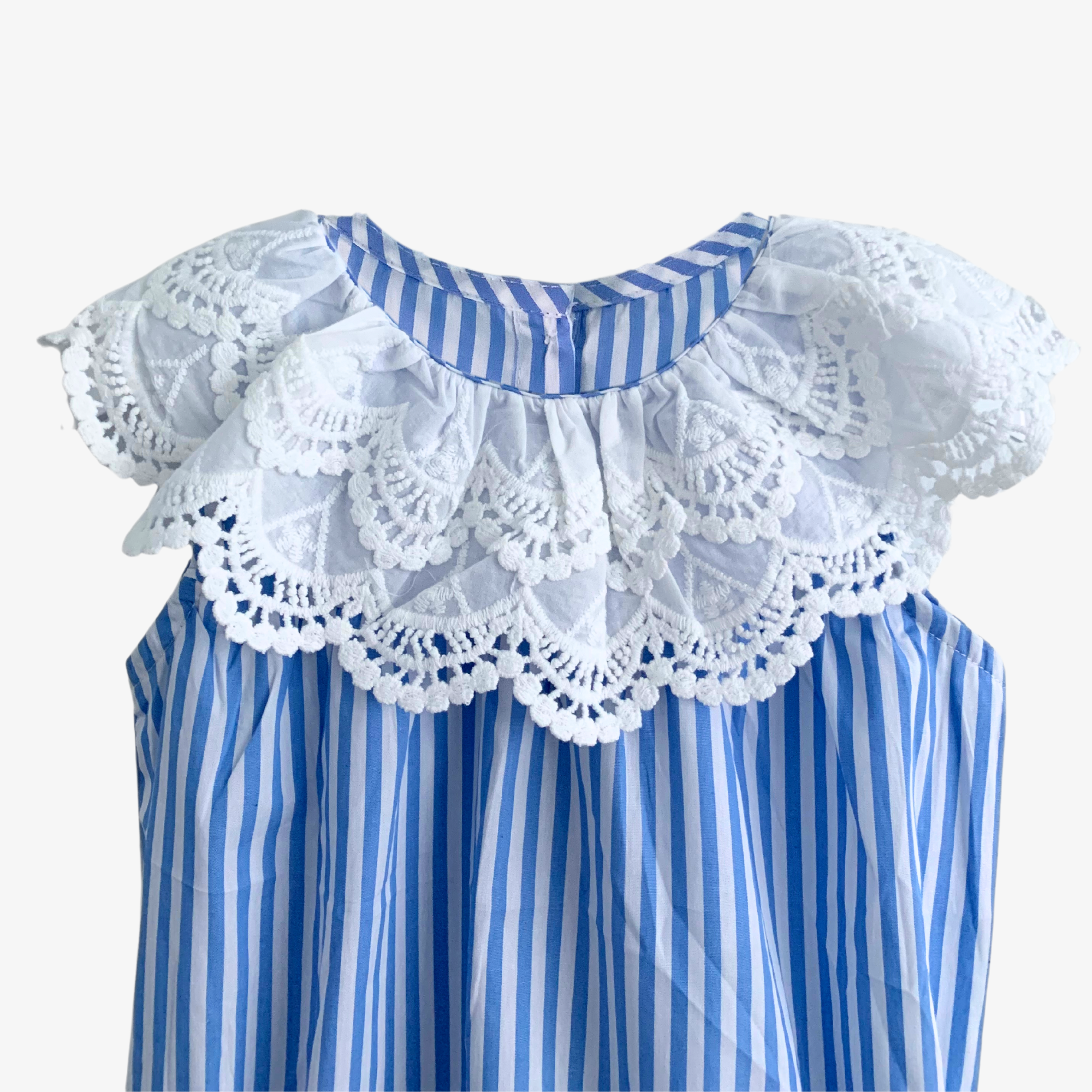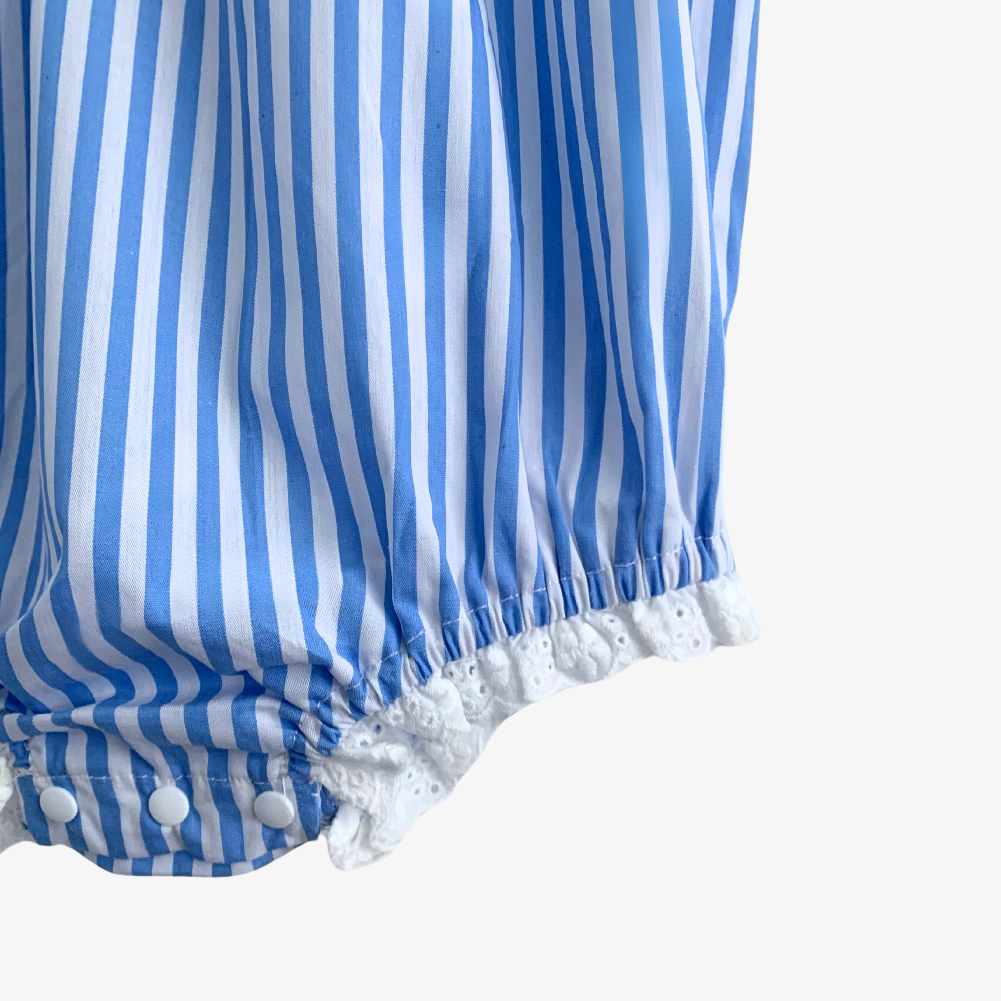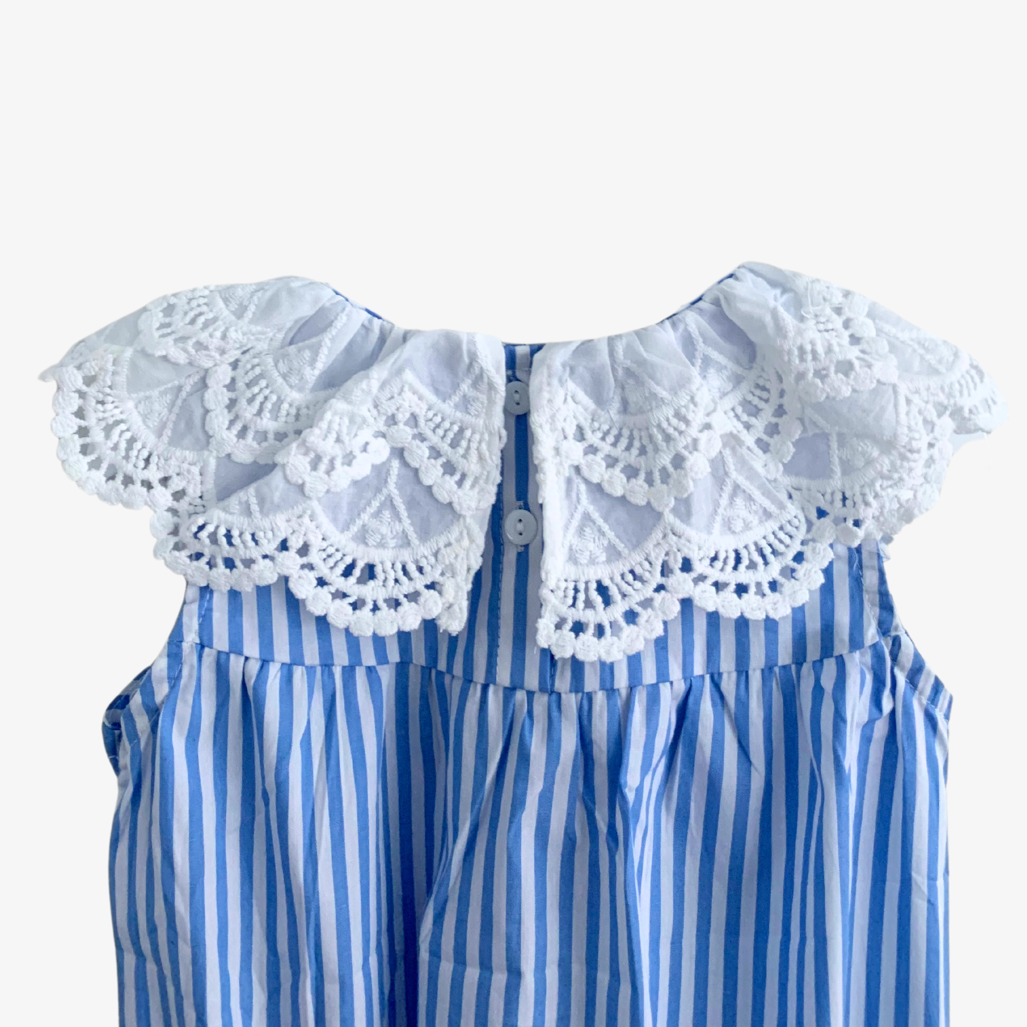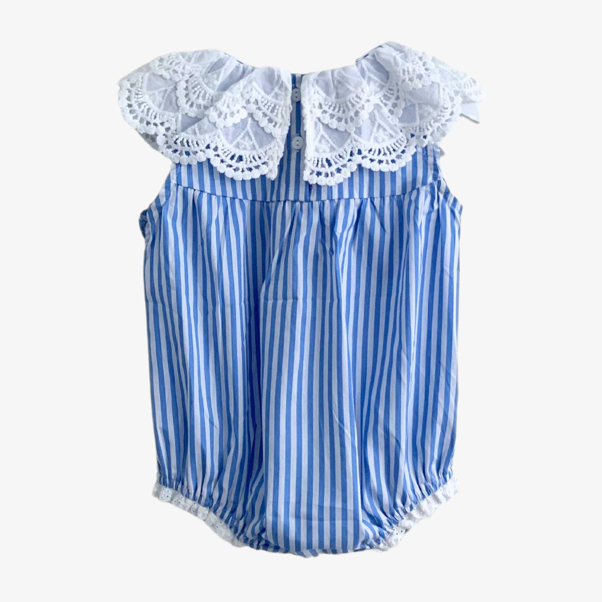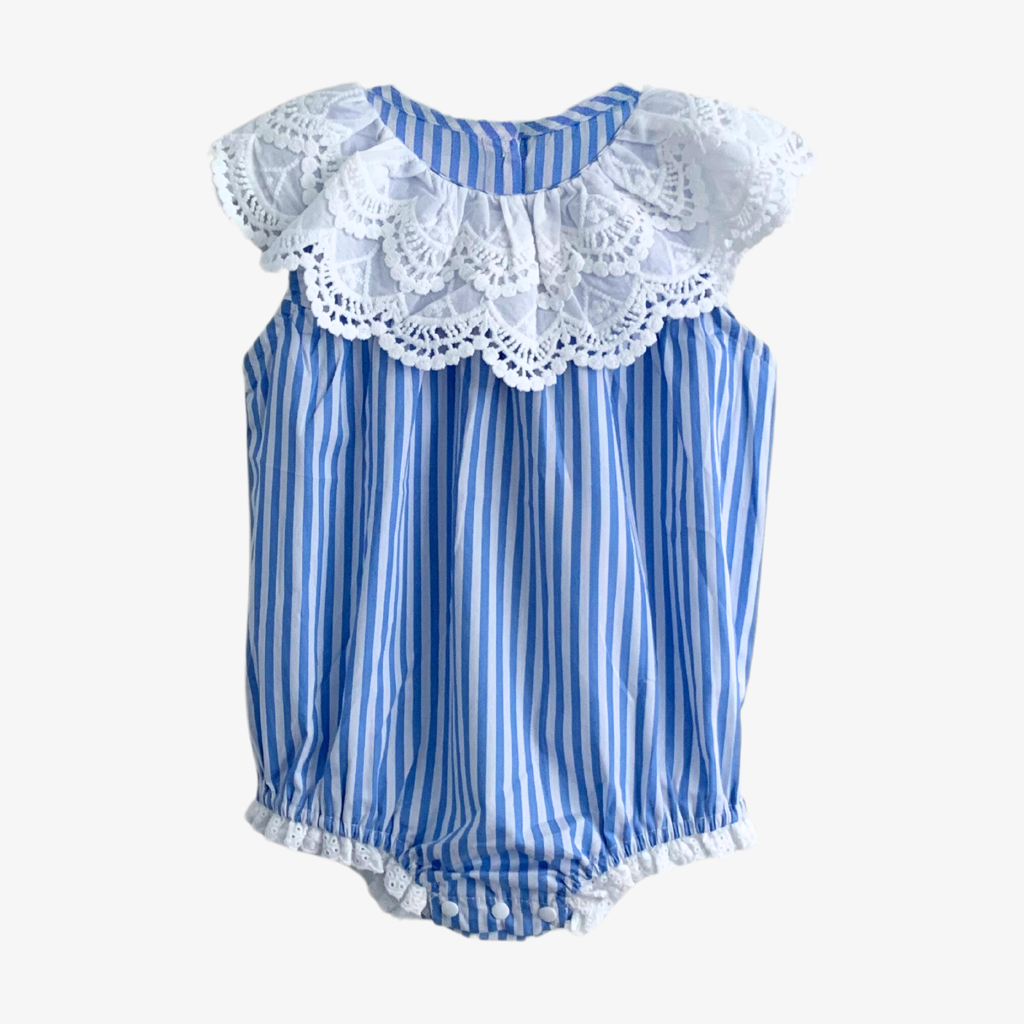 Girls Lace Bib Collar Romper Bubble Blue & White Stripes