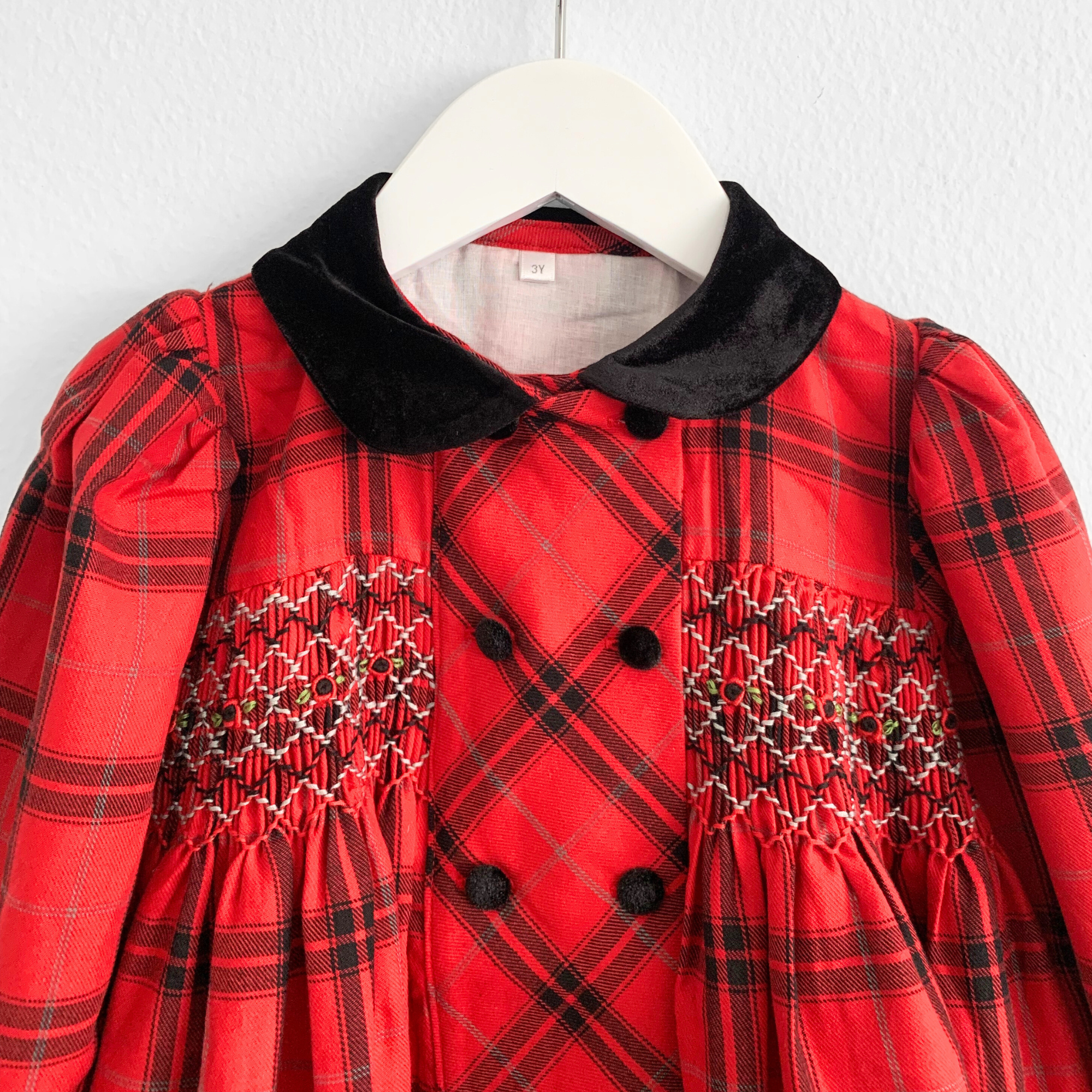 Girls Long Sleeve Embroidered Smocked Dress Plaid