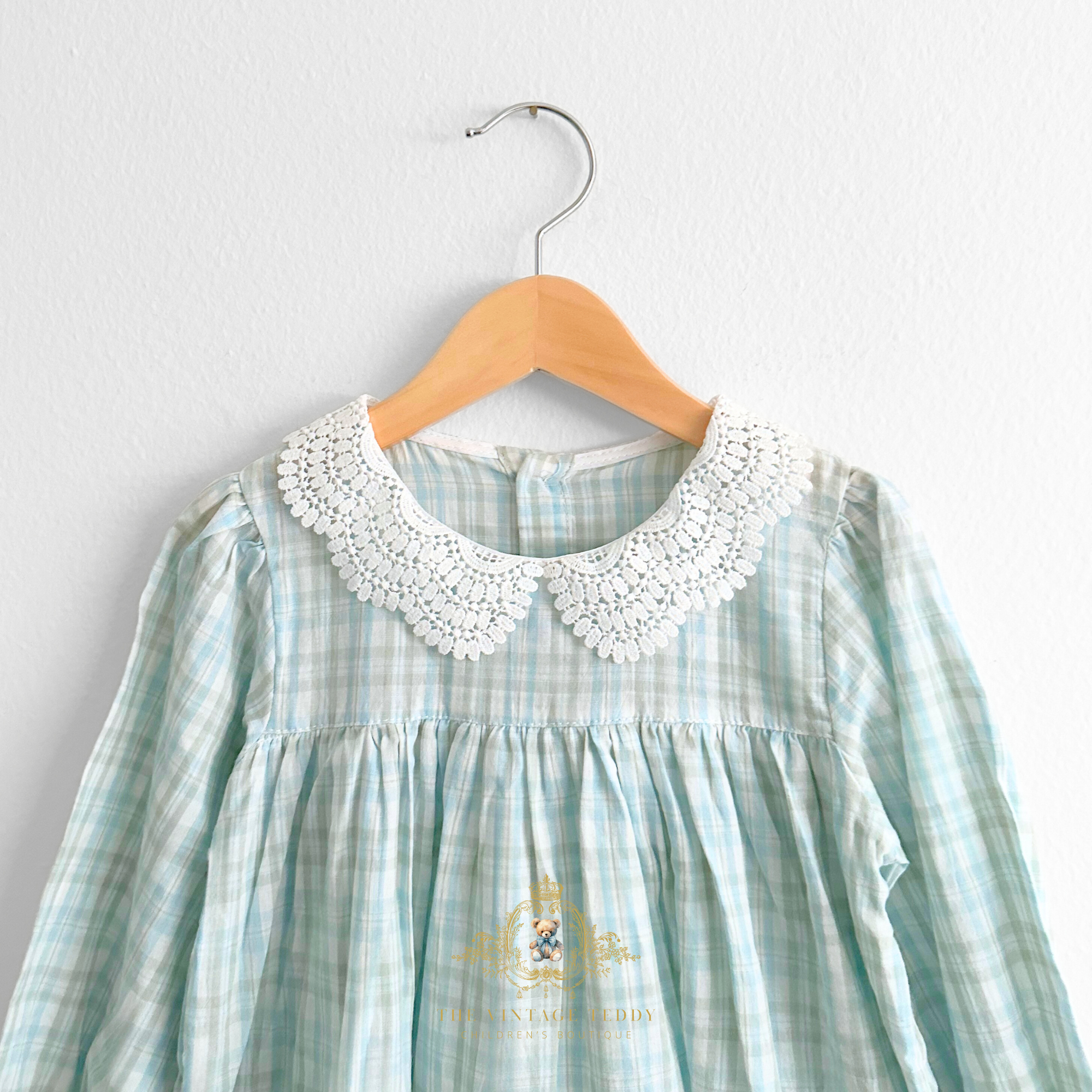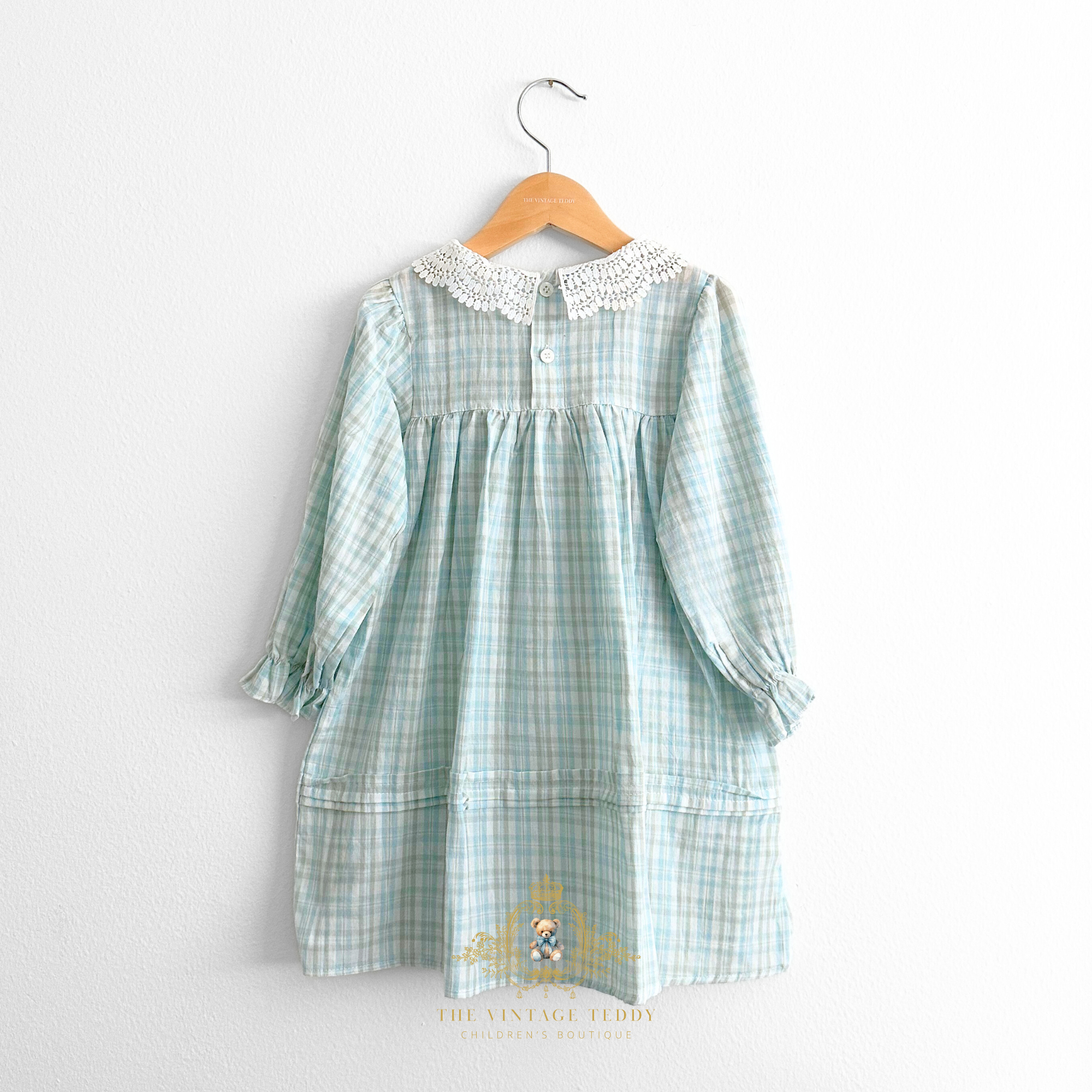 Girls Long Sleeve Eyelet Embroidered Lace Bib Collar Dress Plaid
