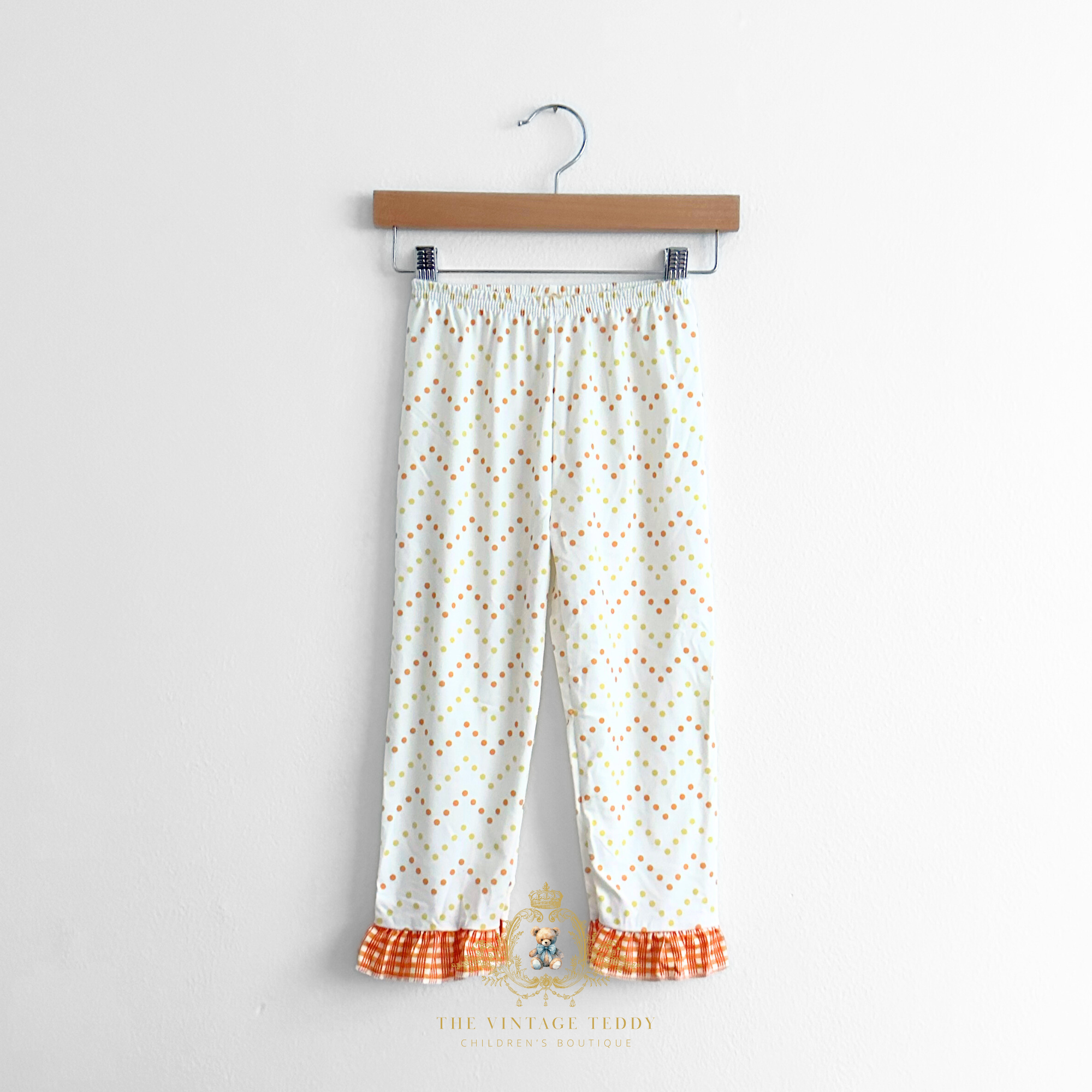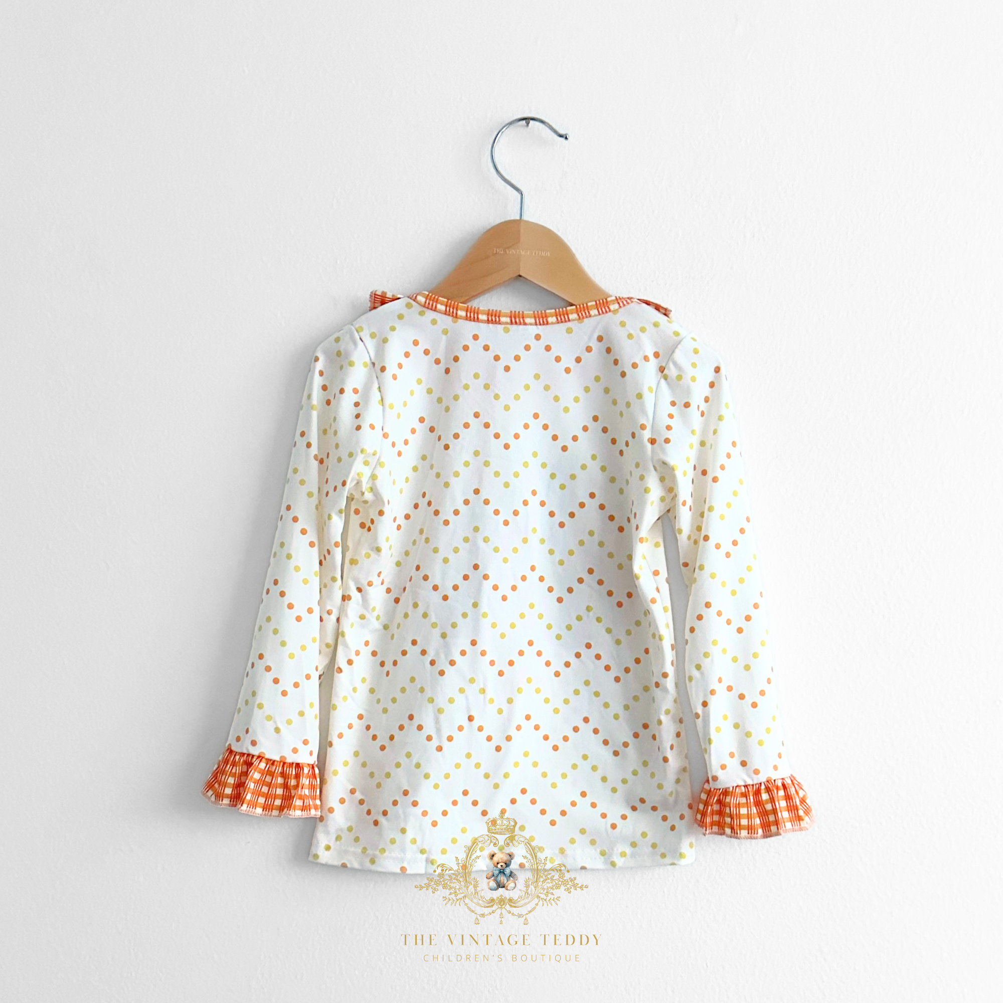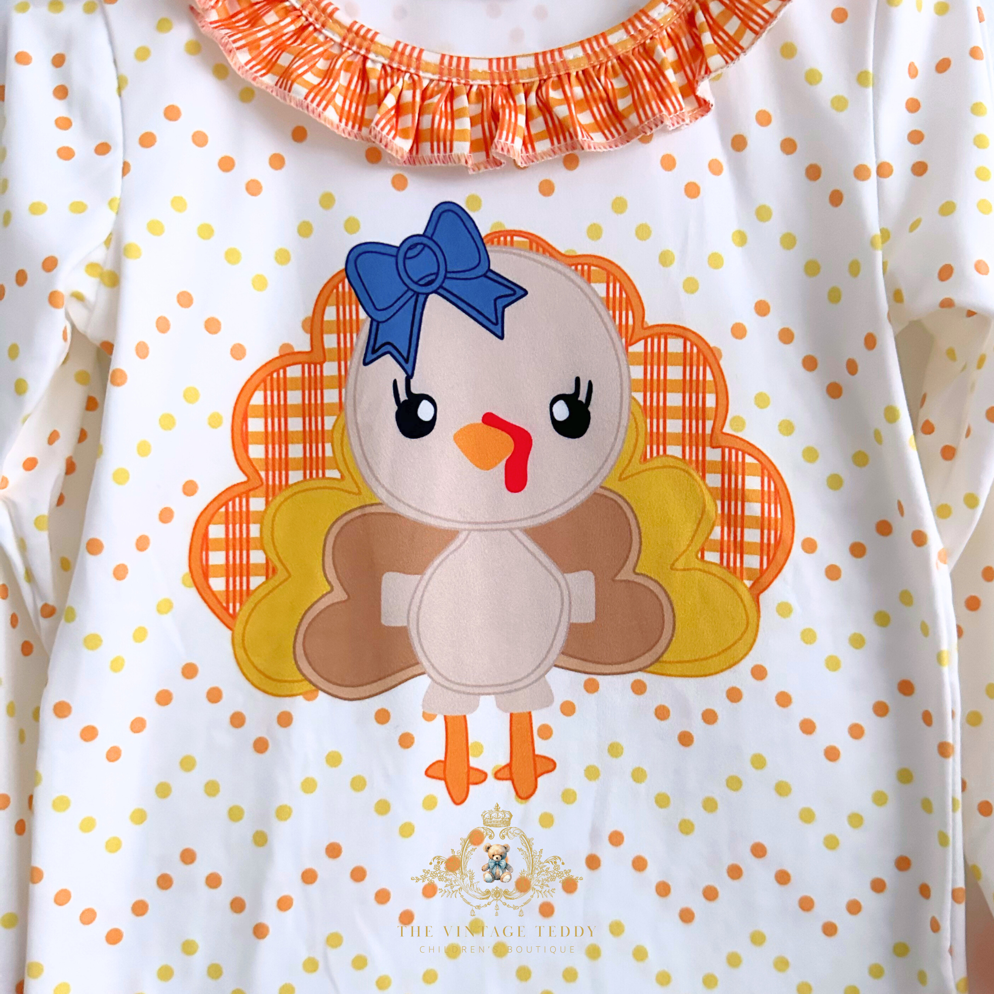 • Details: Cute Turkey Thanksgiving Theme DTF Graphic Print, Polkadots & Gingham Fabric, Long Sleeves, Long Pants, Ruffled Cuff & Hem, Elastic Waistband, Ruffled Round Collar, Comfy Relaxed Fit, Light-weight & comfy
