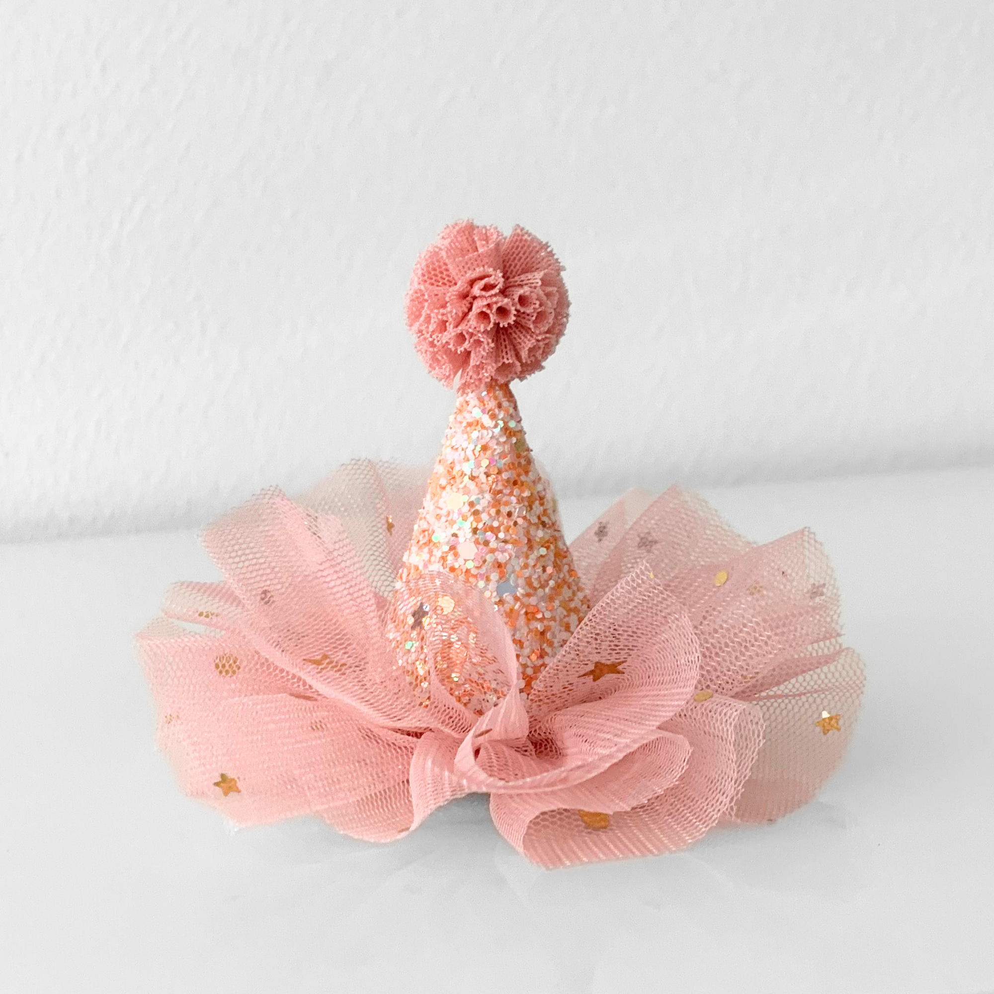 This boutique-inspired girls birthday party hat is adorned with delicate tulle fabric and glitter. Perfect for baby, toddler and little girls, it adds a charming touch to her birthday outfit. With elegant detailing and timeless design this beautiful hair band accessory completes the look. Your precious little one will look adorable in our hair accessories for little girls. Perfect for your little ones first birthday party.