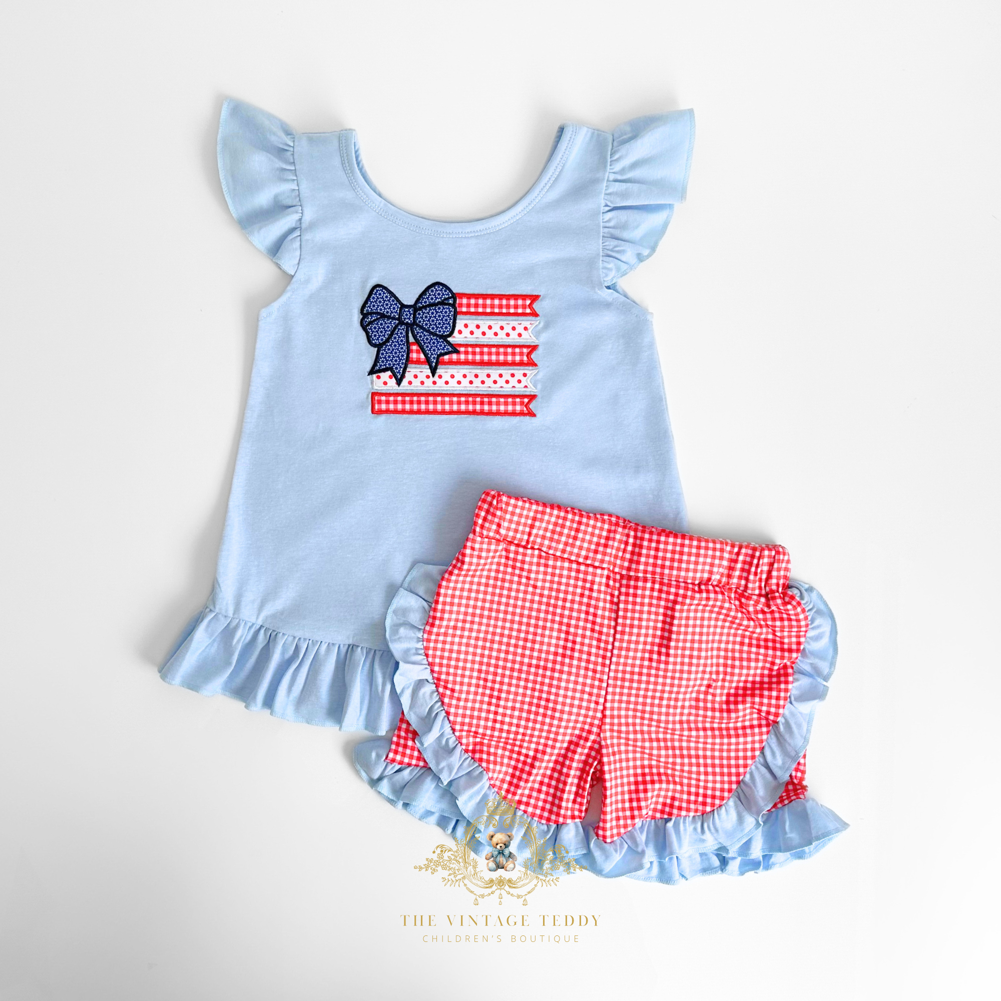 Details: Top: Ruffled Cap Sleeves, Round Collar, Ruffled Hem, Embroidered Patchwork American Flag Appliqué, Lovely Stripes, Sweet & Classic Gingham Graphic Print, Bottom: Elastic Waistband, Ruffled Hem, Light-weight & comfy for all day wear